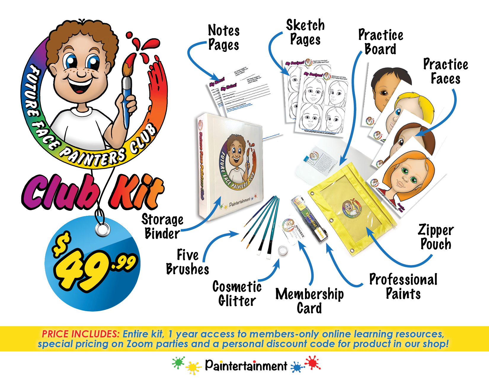 By purchasing this kit, you will also receive 1-year access to our exclusive members’ only website, where we will share videos and tutorials to help your child age 6-12 learn how to face paint! The kit includes: